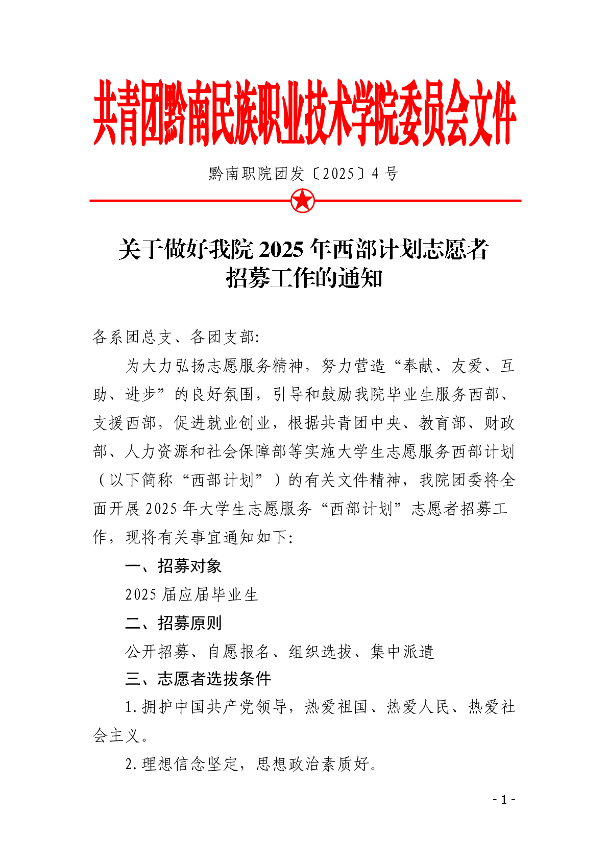 团发〔2025〕4号文件:关于做好我院2025年西部计划志愿者招募工作的通知