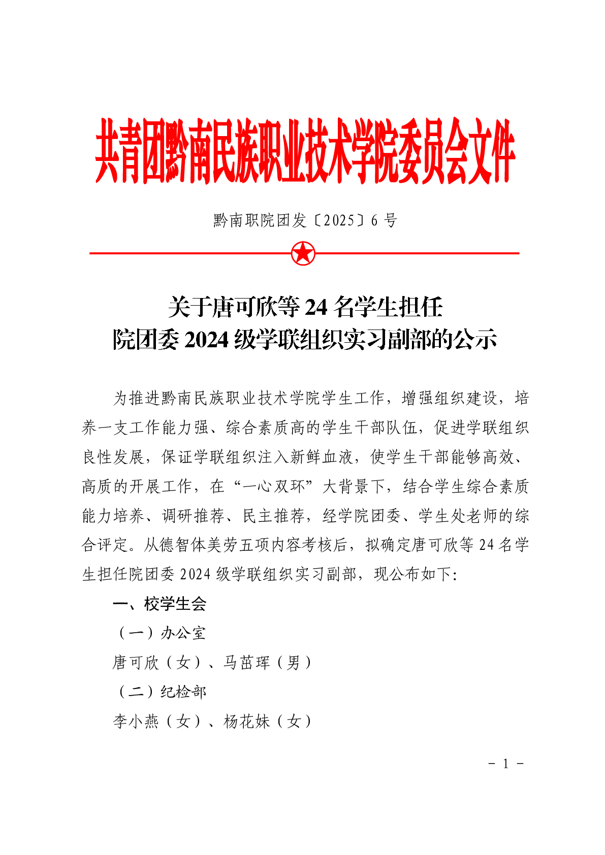 团发〔2025〕6号文件:关于唐可欣等24名学生担任院团委2024级学联组织实习副部的公示