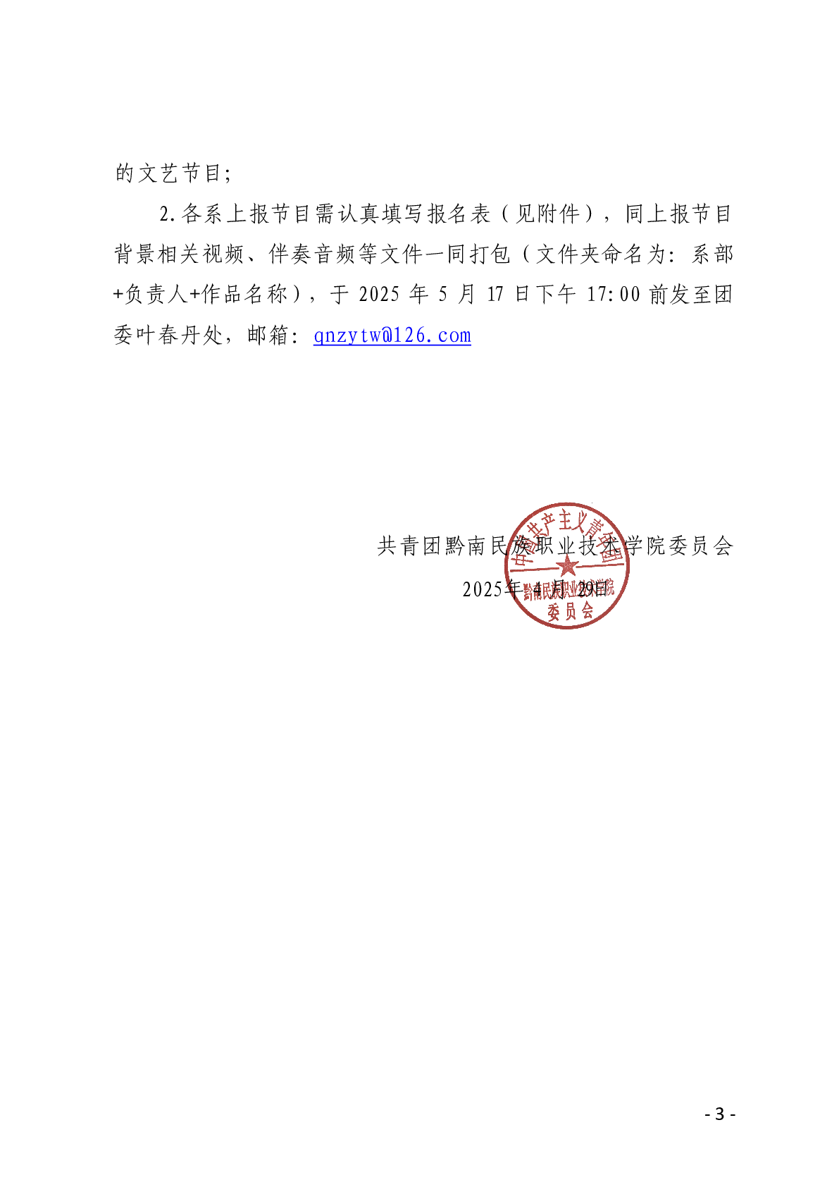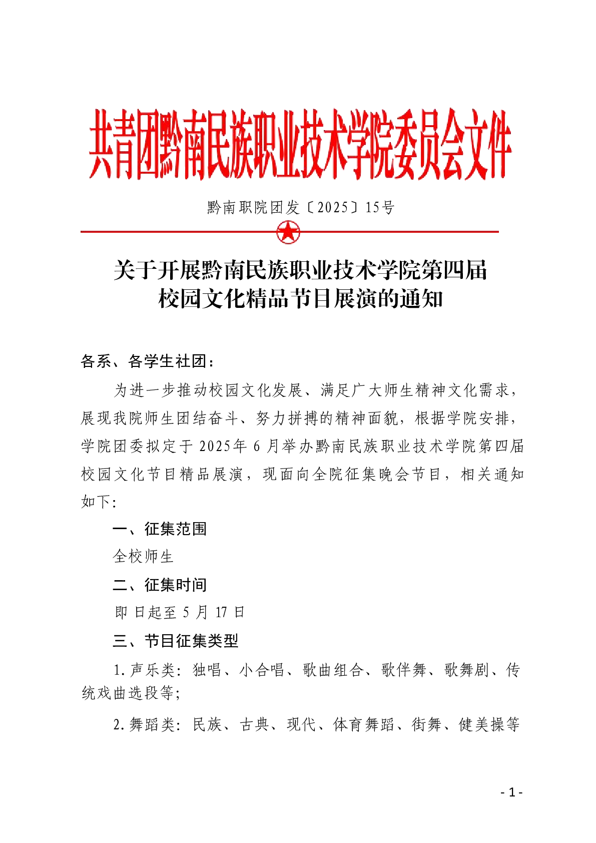 黔南职院团发〔2025〕15号:关于开展校园文化活动精品节目展演的通知_20250429095502