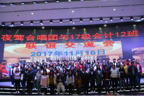11月16日晚7:00,为增进友谊,促进交流学习,黔南职院夜莺合唱团与2017级会计12班开展了一场别开生面的联谊交流会,联谊会在知行楼一楼数字报告厅举行。合唱团成员与会计12班全体同学共约120人参加了此次联谊会。
