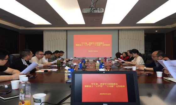 2019年5月24日10:30时,学生处、团委组织全体教职员在知行楼六楼第二会议室召开部门会议,学习贯彻落实《教职员工“十严禁”“十不准”规定》文件精神。