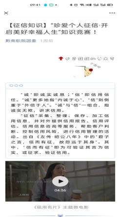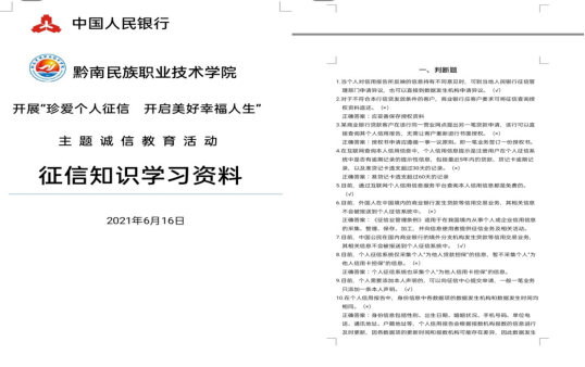 学生处组织以“珍爱个人征信 开启美好幸福人生”诚信教育主题的“学征信知识网络答题竞赛活动”的活动,分别于6月17日--21日 和 6月21--6月27日,在全院学生中开展。