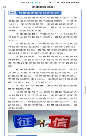活动将诚信教育,预防诈骗教育,远离不良贷、套路贷警示教育融入学生日常管理,让征信意识和金融风险防范意识入心入脑。渗透“诚信”理念,普及征信、金融相关知识,倡导契约精神,促使学生树立诚信观念、增强法律意识、及时履行国家助学贷款合同,有效的将诚信教育转化为大学生的自觉素养与行为,构建以诚信为荣的校园文化氛围的同时,让诚信教育由学校延伸到家庭,拓展到社会。国家助学贷款学生履约正是毕业生踏入社会的第一份征信记录,第一份履约行为,所以本次活动对毕业生意义重大。在学院“33753”育人体系工作要求下,充分发挥了资助育人的功能。