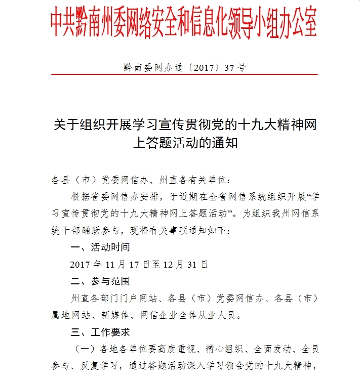 关于组织开展学习宣传贯彻党的十九大精神网上答题活动的通知