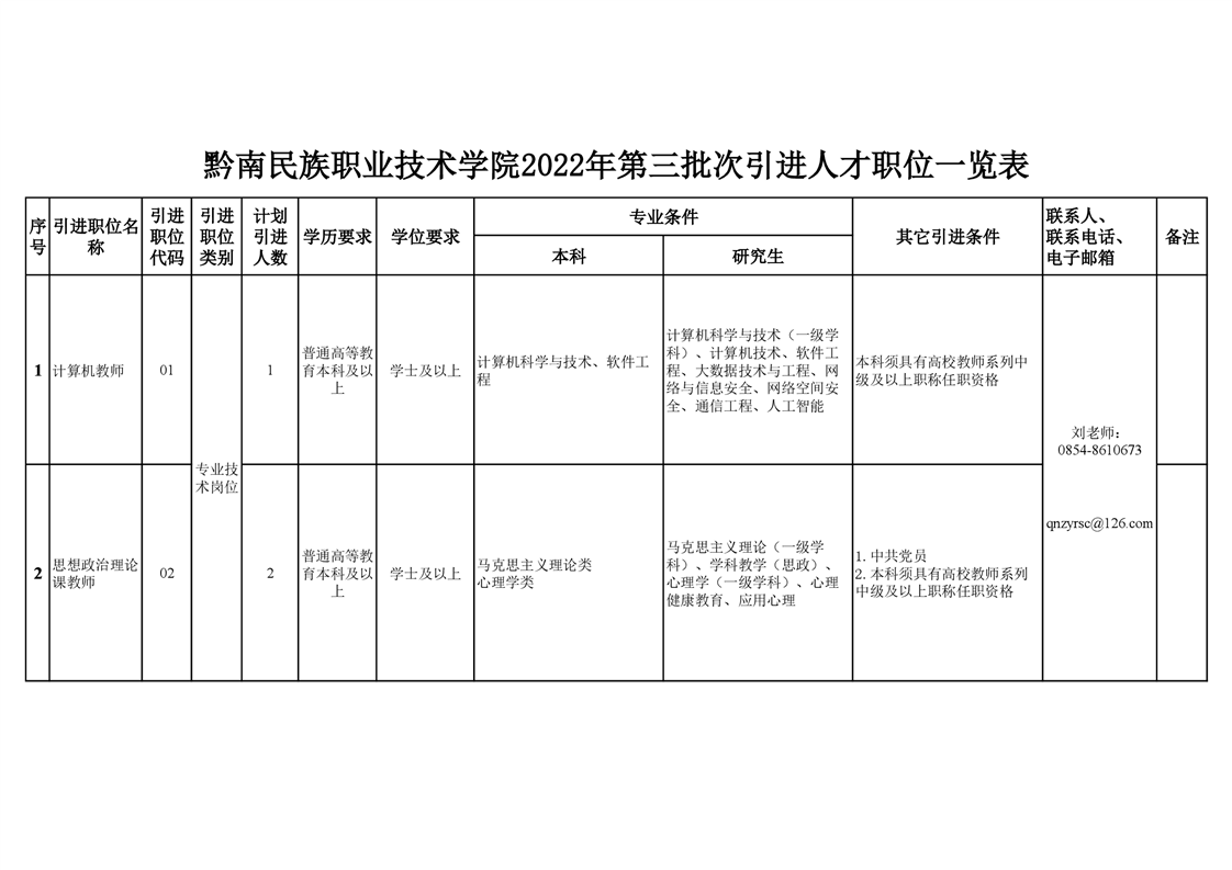黔南民族职业技术学院2022年第三批次引进人才职位一览表