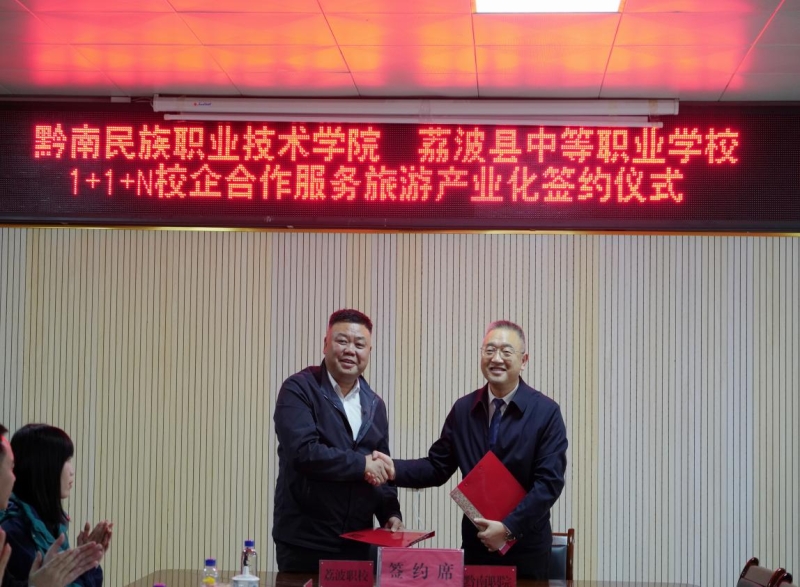 4月8日,黔南职院 荔波职校携手推进“1+1+N”校企合作服务旅游产业化签约仪式在荔波举行。学院党委副书记、院长刘荣鹏,荔波职校、荔波县相关旅游企业负责人参加仪式。