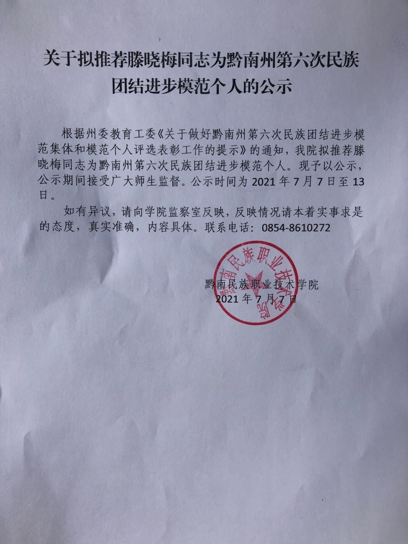 关于拟推荐滕晓梅同志为黔南州第六次民族团结进步模范个人的公示