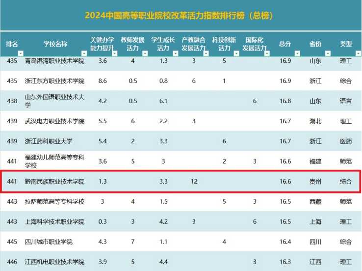 5月30日,高职教育权威机构——“高职发展智库”发布“2024中国高等职业院校改革活力指数排行榜”,学院进入“中国高等职业院校改革活力”500强,由去年全国的1266名外跃升至今年的441名,是继去年进入中国高职高专综合实力排名500强、西部425所高职高专20强后又进入的又一个中国500强。