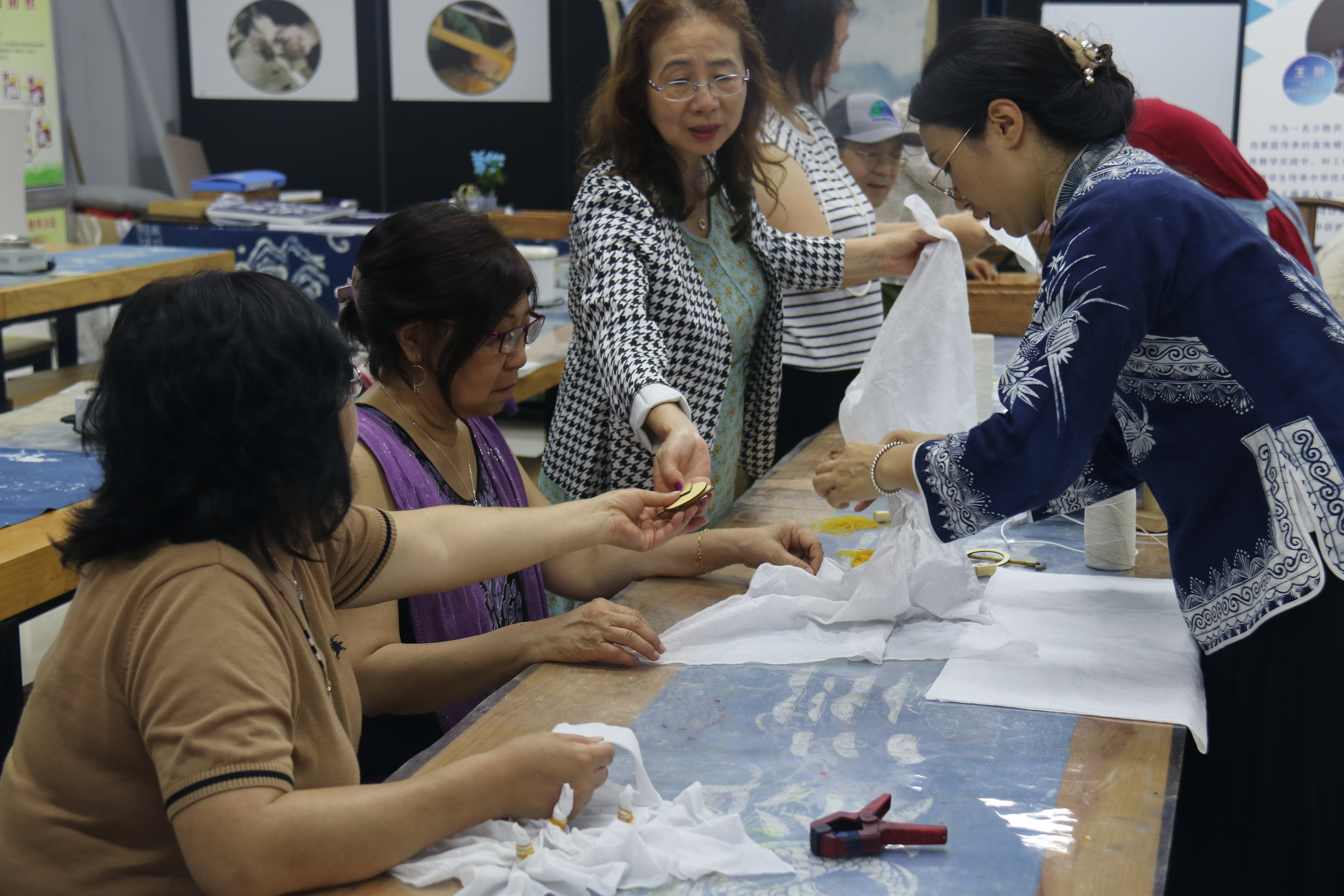 随后,在学院专业教师的指导和帮助下,访问团教师们亲自动手体验扎染制作,学习了如何选材、设计图案、捆扎布料以及染色等技巧,将自己的创意融入到作品中。经过一番努力,一件件色彩斑斓、图案独特的扎染作品应运而生。访问团教师们纷纷表示,通过亲手制作,切实体验了扎染独特的艺术魅力,感受到了中国传统文化的博大精深。