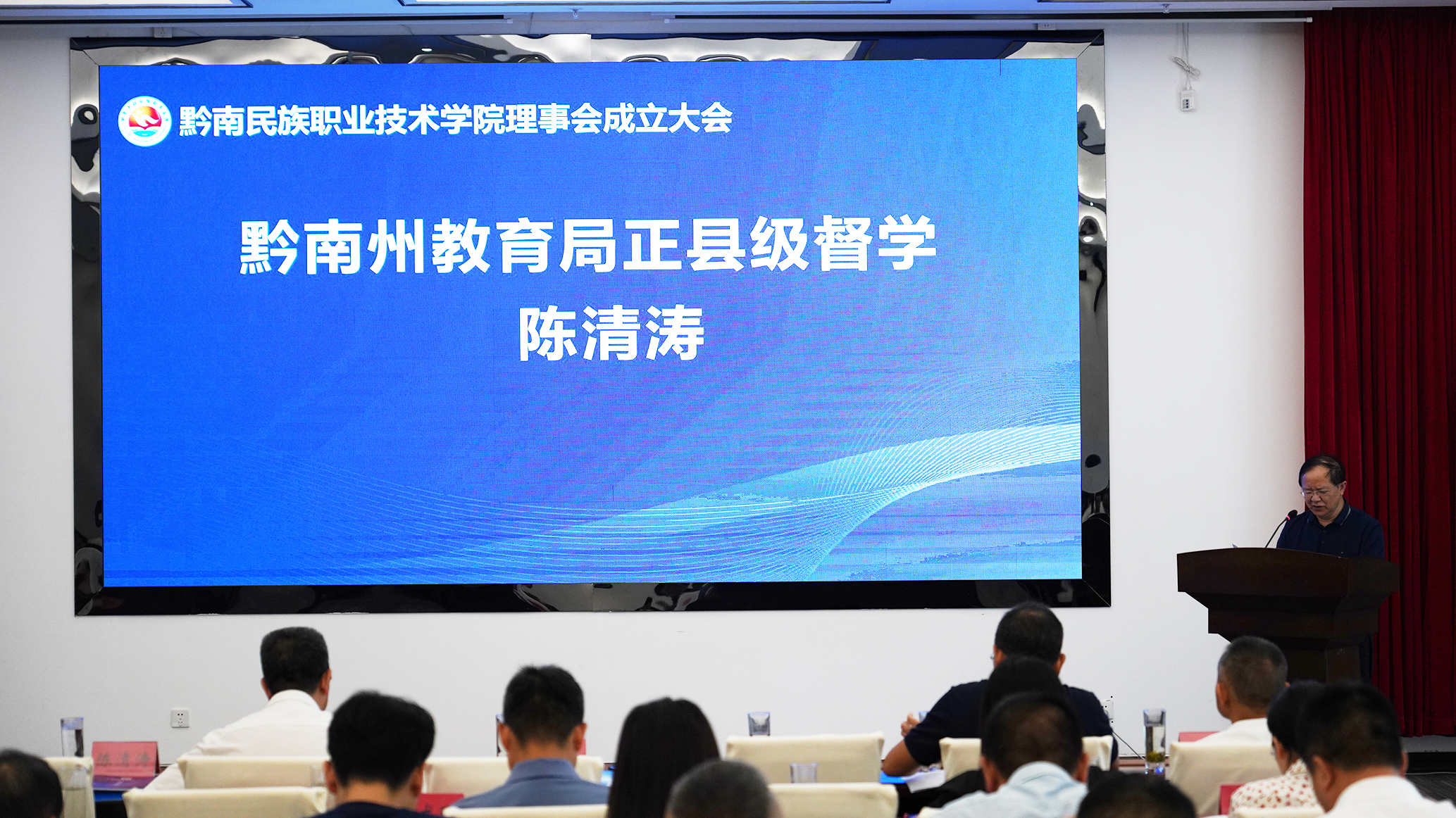 为适应“五个新黔南”对高素质技术技能型人才的需求,进一步提升黔南职院办学治校水平,充分发挥政府统筹、行业支持、企业参与的协同优势。7月19日,黔南民族职业技术学院理事会成立大会在知行楼六楼职教联盟多功能厅举行。州政府经济发展研究中心主任张国乾、州委组织部副部长李凌霄、州委编办副主任王平利、州科协党组书记陈情、州教育局正县级督学陈清涛、黔南职院党委书记罗俊、黔南民族师范学院副校长李泽平出席;州发改委、州工信局、州人社局、州商务局、州住房城乡建设局、州国资局、州水务局、州农业农村局、州文旅局、州社科联等部门相关负责同志,都匀市绿茵湖街道办事处相关负责同志,省内外行业协会、科研院所、企业代表参加;黔南职院行政领导班子成员及各系各部门负责同志共同见证了这一重要时刻。会议由学院党委委员、副院长王焱主持。