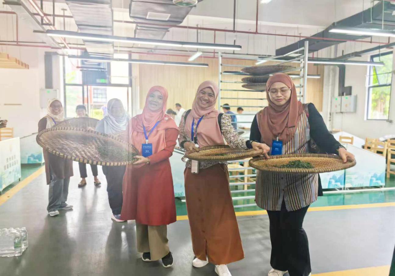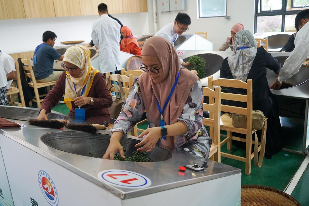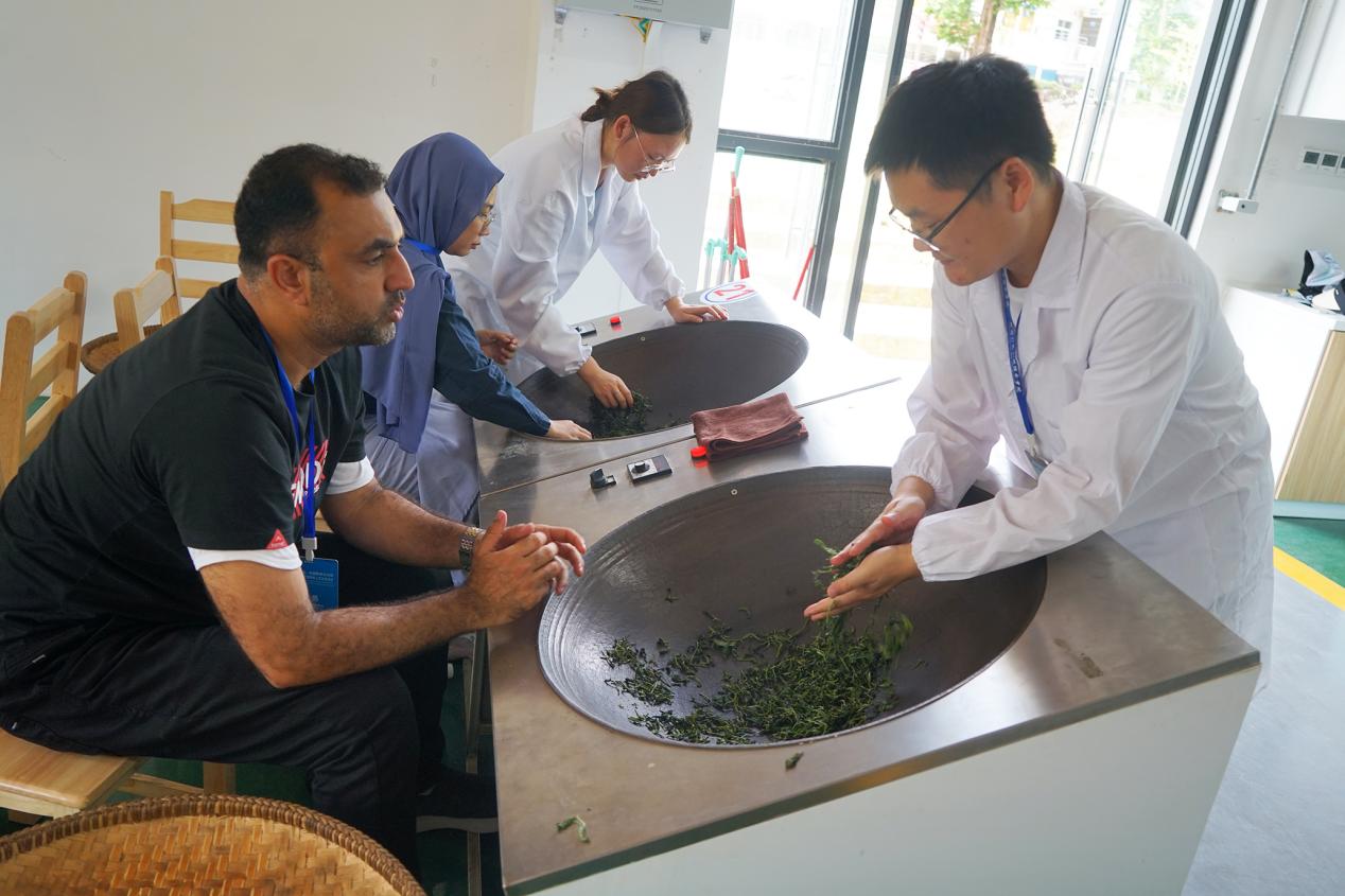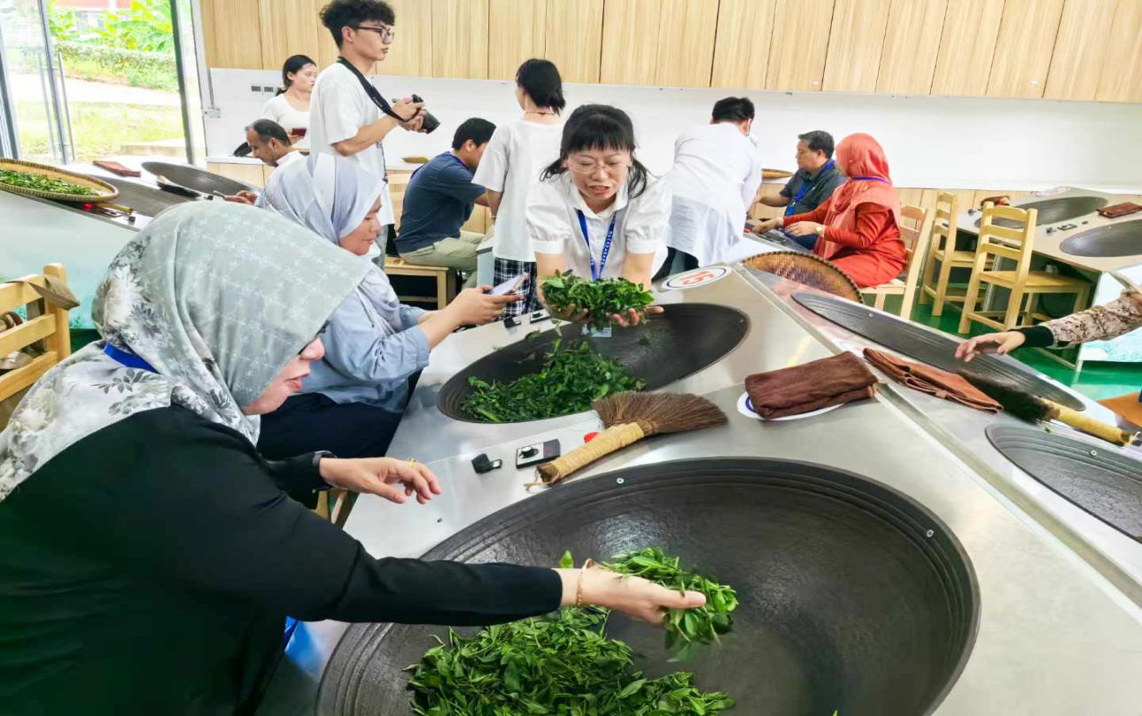 在都匀毛尖茶手工制作体验活动中,学院旅茶系专业教师详细介绍了都匀毛尖茶手工制作的步骤,国际师生们兴致勃勃地参与其中,亲手感受茶叶在指尖的变化,体验了杀青、揉捻、炒干等茶叶制作工序。随后,学院旅茶系学生向国际师生们展示了都匀毛尖茶的冲泡技巧,在品味茶香四溢的美好时刻,国际师生不仅领略了中国茶文化的深厚底蕴,还通过交流分享,增进了彼此之间的友谊。