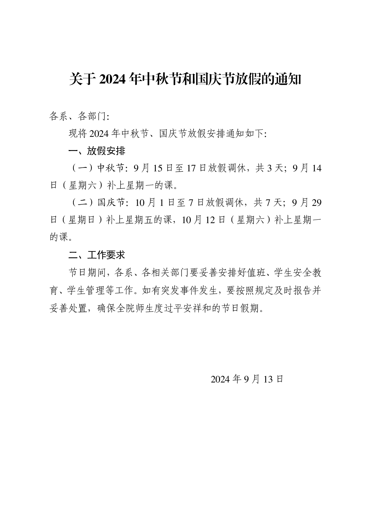 关于2024年中秋节和国庆节放假的通知