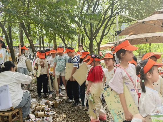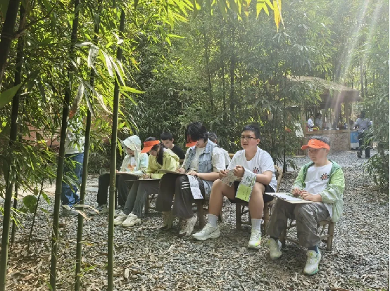 竹荫为幕,画板作席,小艺术家们跟着美育导师开启五感观察:指尖触摸竹衣的斑驳纹路,鼻尖轻嗅新笋的泥土芬芳,耳畔捕捉竹叶与风的私语。水彩点染出竹浪层层叠翠,彩铅勾勒的竹枝与真实竹林虚实交错,拓印画纸上跃动着竹影的光斑舞步。