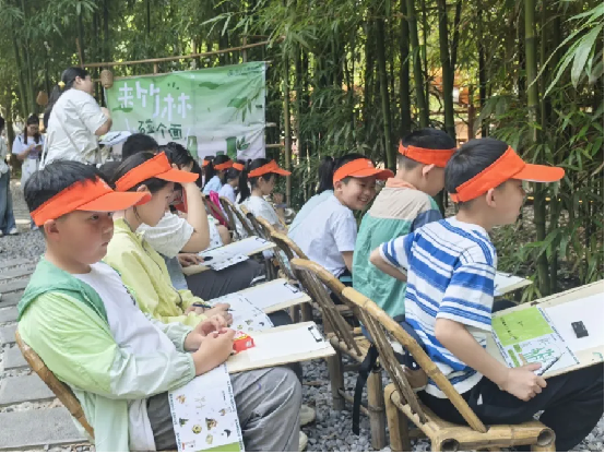 黔南职院研学旅游景区东篱小院迎来了一场特别的“竹林会面”。桃子儿童美学的数名小画家,以“来竹林 碰个面”为主题,在青翠竹影间展开自然写生课堂。孩子们用画笔叩响竹节,以色彩对话清风,让东篱小院的每一片竹叶都成了灵感的信笺。