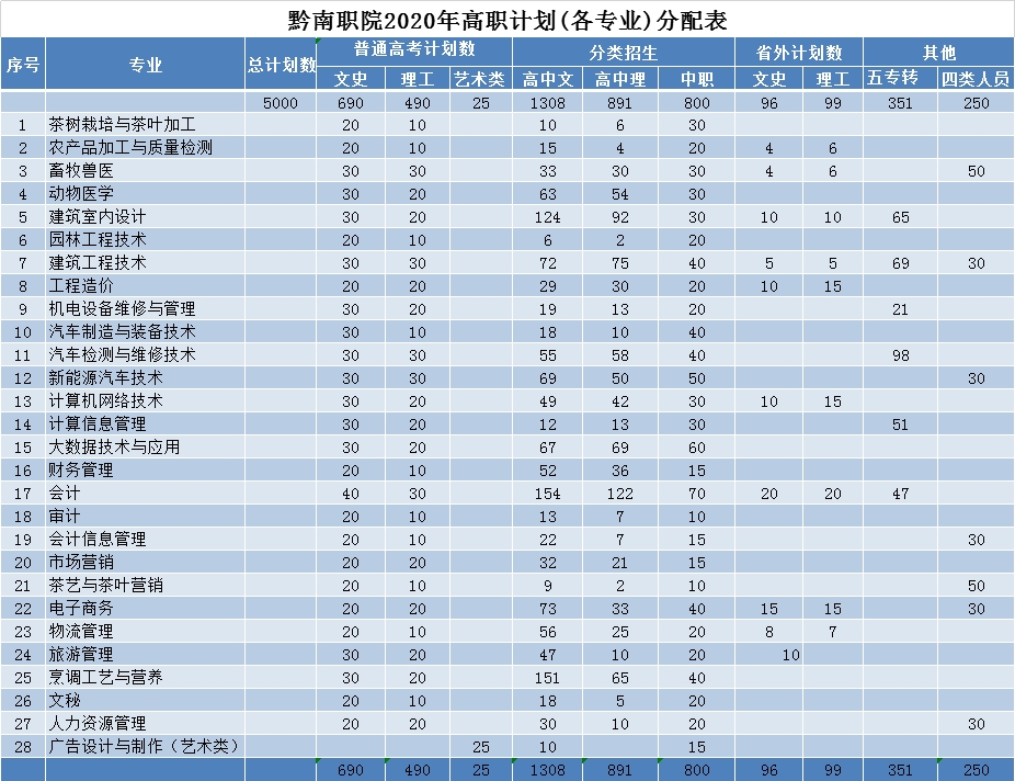 黔南民族职业技术学院2020年高职招生计划(各专业)