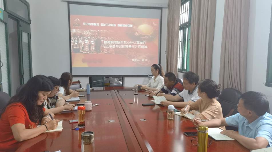 为迅速提升招生就业队伍的思想自觉、政治自觉和行动自觉,结合《中共贵州省委关于深入学习贯彻习近平总书记视察贵州重要讲话精神的通知》要求,6月15日上午,招生就业处全体工作人员在会议室集中学习习近平总书记视察贵州时的重要讲话精神,副处长胡江领学。