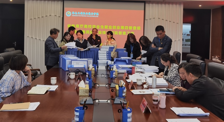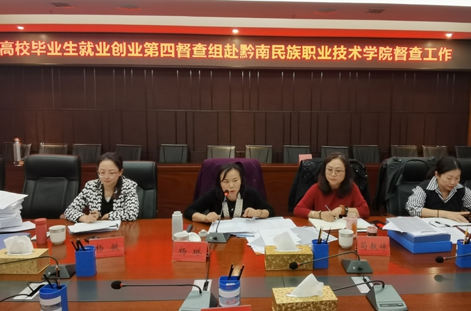 为贯彻落实党中央、国务院及省委、省政府有关就业创业决策部署和《教育部关于做好2021届全国普通高校毕业生就业创业的通知》(教育〔2020〕5号)等文件精神,10月19日下午,以贵州民族大学招生就业处处长杨琳为组长、贵州大学招生就业处副处长杨敏、遵义职业技术学院招生就业处副处长苟敖妹、贵州电子商务职业技术学院招生就业处科长李培培为成员的省教育厅第四督查组一行4人赴我院开展2021届高校毕业生就业创业实地督查工作。院党委书记罗俊,院党委委员、副院长钟少兰,各系总支书记(系主任),学管主任,就业工作人员以及招生就业处班子成员参加本次督查工作。 督查组一行在听取钟少兰副院长关于我院2021届毕业生就业创业工作汇报和罗俊书记关于学院办学情况介绍后,按照督查程序认真开展督查工作。在反馈会上,杨琳组长在肯定我院毕业生就业工作的同时,对照督查要求,也诚恳地指出存在的一些问题,如有的就业材料收集整理不规范,有的专业系统上数据与佐证材料不吻合,有的建档立卡毕业生帮扶材料书写不规范,有的就业合同内容有缺项,有的就业质量有待提高等。 钟少兰副院长代表学院对省教育厅第四督查组指出我院毕业生就业创业工作存在的问题,当即表示将逐一整改,下一步将加大工作力度,加强就业管理,努力提高工作质量和工作水平。