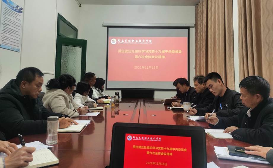 为深入学习贯彻中国共产党十九届六中全会精神,2021年11月15日下午,招就处全体人员在会议室集体学习了中国共产党十九届六中全会精神,本次学习由高尚处长领学《中国共产党第十九届中央委员会第六次全体会议公报》。