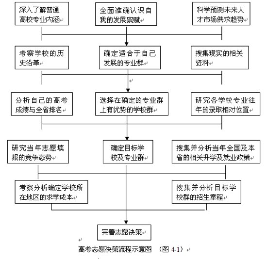 根据学业规划的指导原则,在高考志愿决策时,我们首先是选择专业,然后根据专业选择学校,选择在我们所定的专业上有办学优势的学校,最后才是根据分数在我们所选的学校群中进行确定。我们可以用流程图的方式一目了然地将各个过程展现出来。供考生及家长参考。