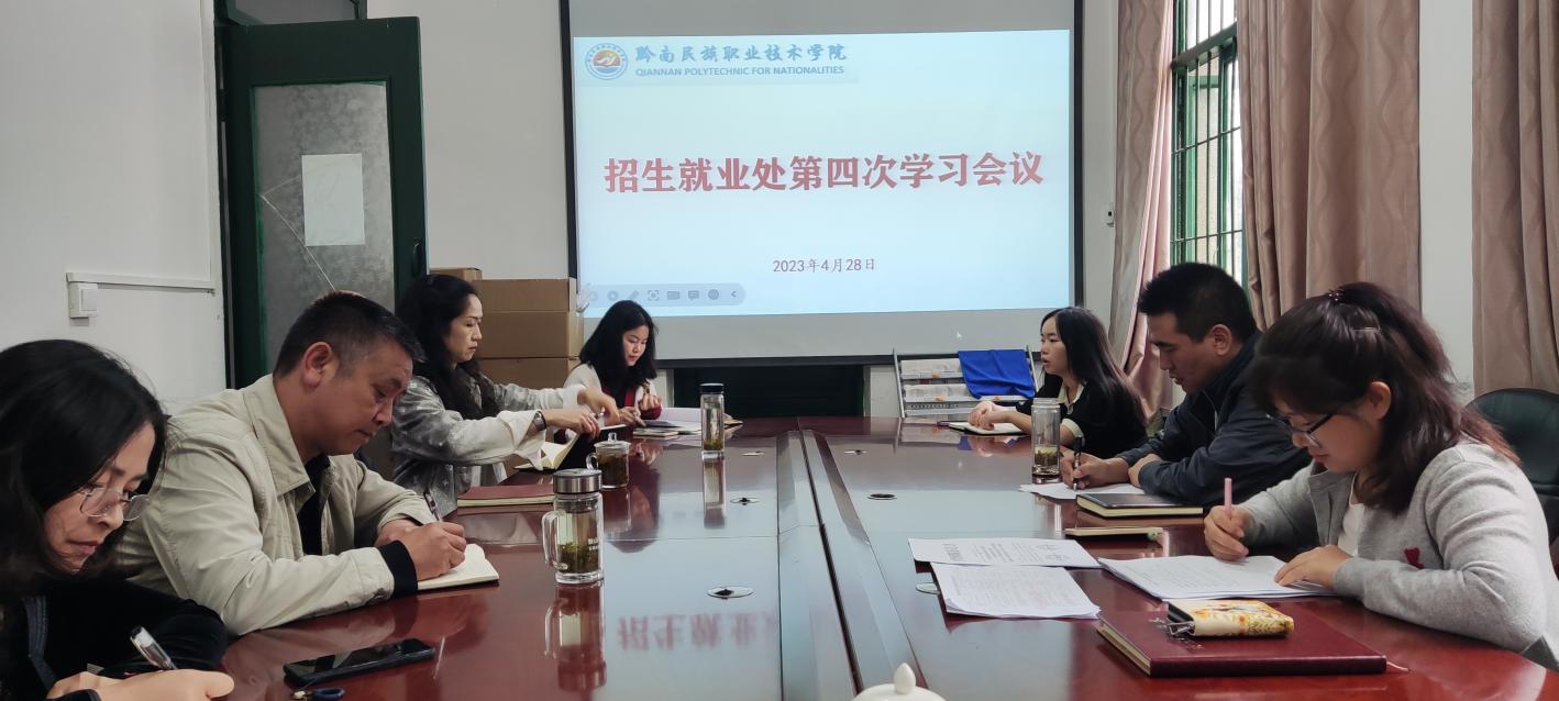 4月28日,招生就业处组织全体成员进行第四次集中学习。此次学习内容有《贵州省学习贯彻习近平新时代中国特色社会主义思想主题教育工作会议召开》文件精神、《习近平新时代中国特色社会主义思想主题教育工作会议精神》、《黔南州教育系统师德师风专项教育和治理工作实施方案》以及《中共黔南民族职业技术学院委员会师德师风专项教育和治理工作方案》。随后,以“借培训之名组织公款旅游问题及教训”为主题对全体成员进行了警示教育。