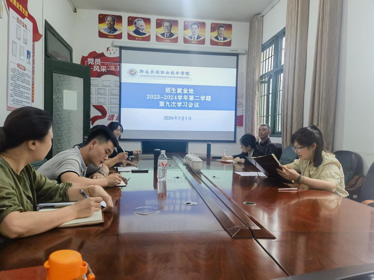 为深入学习贯彻习近平新时代中国特色社会主义思想,开展法律法规政策学习,7月1日上午,招生就业处全体成员在会议室进行集中学习,吴文娟、钟翔、肖文韬、王蕊老师分别领学了“习近平在中共中央政治局第十五次集体学习时的重要讲话精神”“习近平在全国科技大会、国家科学技术奖励大会、两院院士大会上的讲话精神”“习近平在山东省济南市企业和专家座谈会的重要讲话精神”《中华人民共和国国家安全法》以及《贵州省学校学生人身伤害事故预防与处理条例》。