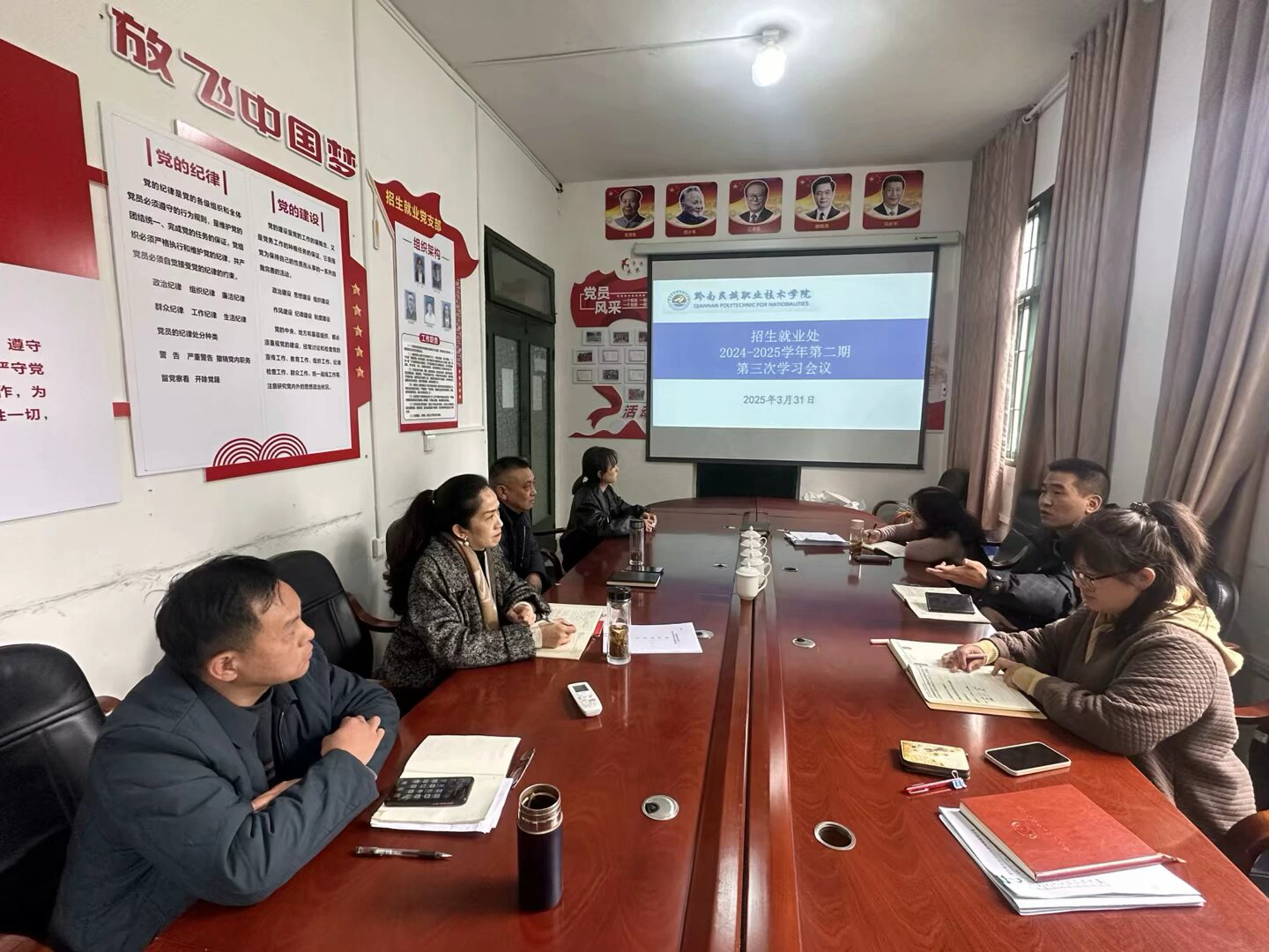 3月31日,招生就业处组织本学期第三次集体学习。会议传达学习习近平总书记在贵州考察时的重要讲话精神、学习贯彻全省领导干部会议精神以及中共中央办公厅关于在全党开展深入贯彻中央八项规定精神学习教育的通知等文件精神,安排部署相关工作。吴文娟主持会议,部门全体成员参加。