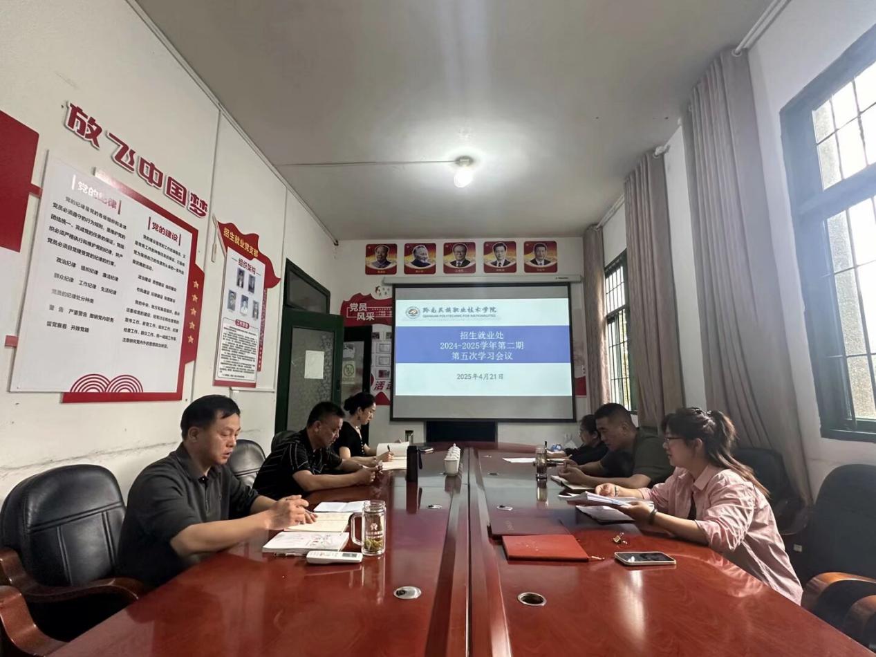 4月22日,招生就业处开展第五次集中学习。会议传达学习了习近平总书记在《求是》发表的重要文章《朝着建成科技强国的宏伟目标奋勇前进》以及《中共贵州省委关于认真学习宣传贯彻落实习近平总书记在贵州考察时的重要讲话精神的通知》等文件精神,安排部署落实工作。吴文娟主持会议,部门全体成员参加。