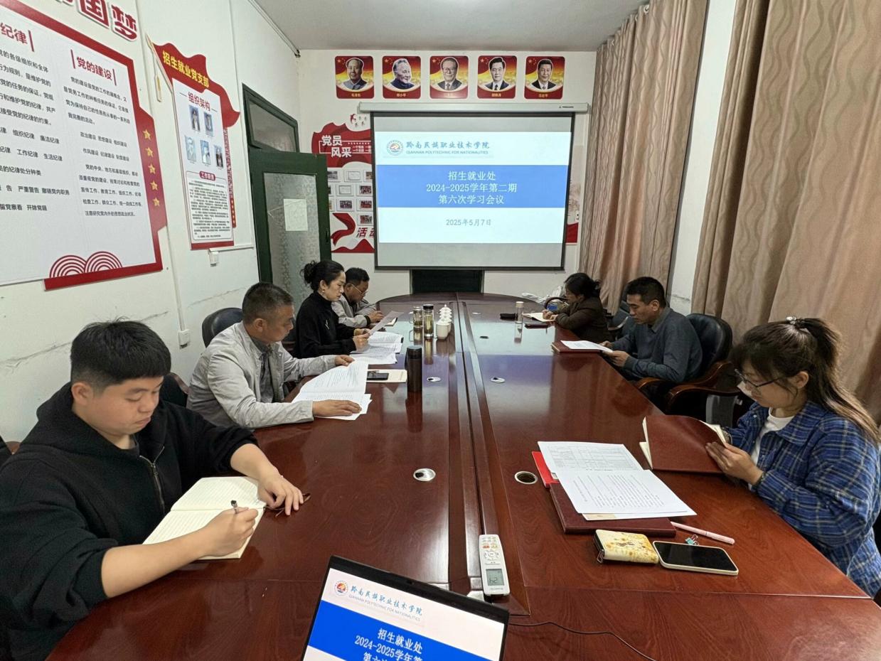 5月7日,招生就业处在部门会议室组织全体教职工开展第六次集中学习。会议学习了习近平在参加首都义务植树活动以及在中央周边工作会议上的重要讲话精神。吴文娟主持会议,会议对高考招生宣传以及2025年春季毕业生招聘会等工作作了安排部署。