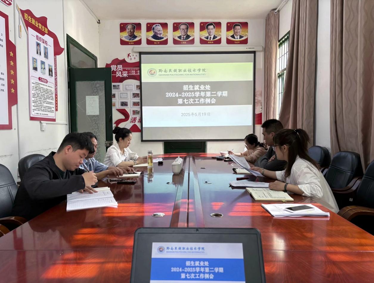 5月19日,招生就业处全体教职工在部门会议室召开本学期第七次工作例会。会议学习了习近平总书记在中共中央政治局第二十次集体学习时的重要讲话精神以及高考招生“30个不得”“八项基本要求”等招生纪律要求。会议对近期工作进行了安排部署并提出了工作要求。本次会议由吴文娟同志主持,胡江同志作补充发言。