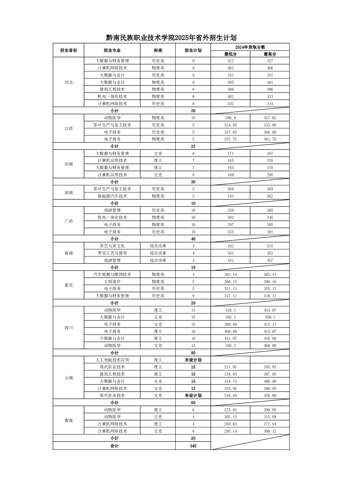 黔南民族职业技术学院2025年高考省外招生计划表