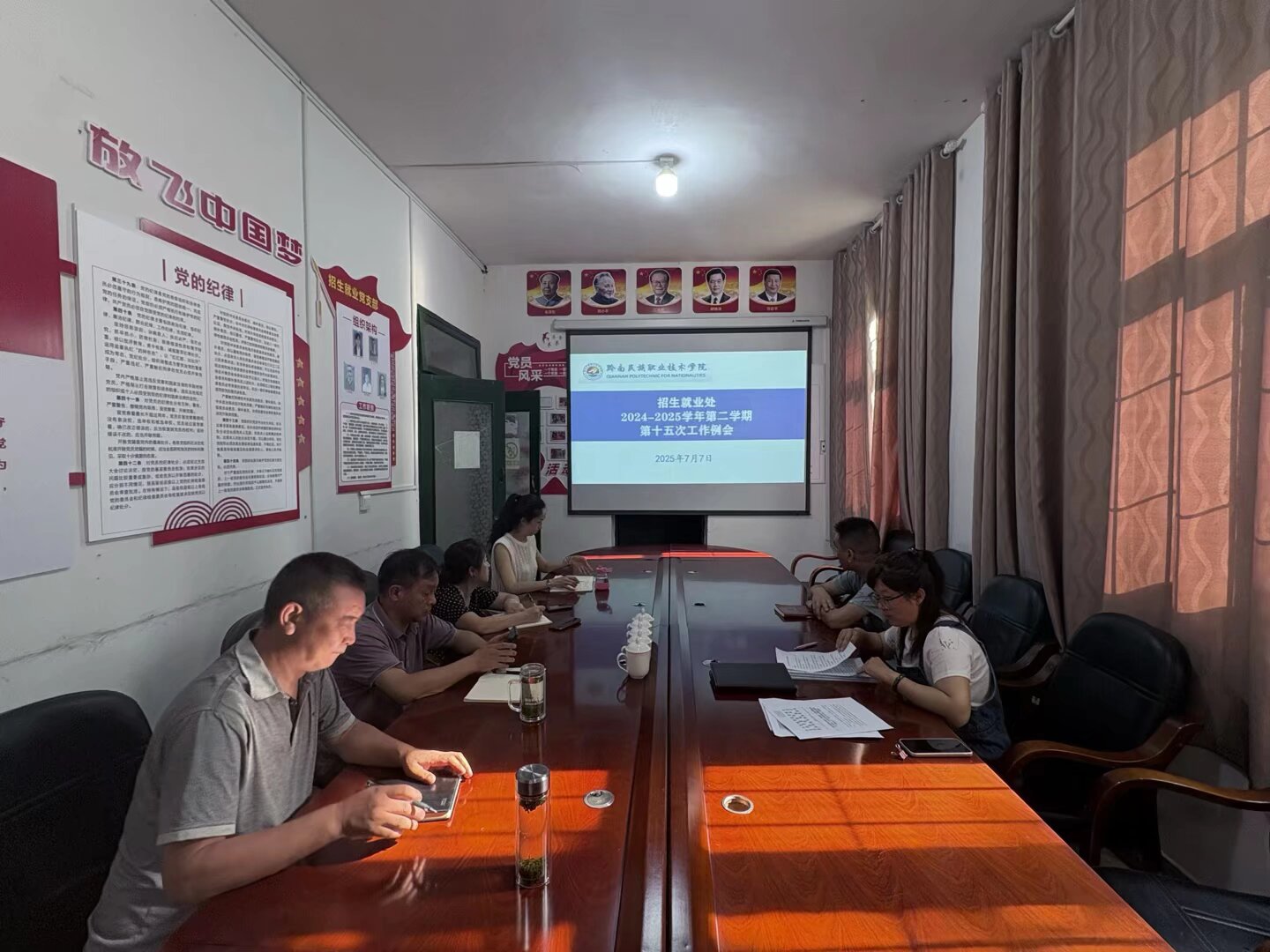 2025年7月7日招生就业处在部门会议室召开第十五次工作例会。会议传达学习习近平总书记在中共中央政治局第二十一次集体学习时的重要讲话及中央、省州有关文件精神,对近期工作进行安排部署,并强调合同审签工作纪律要求。