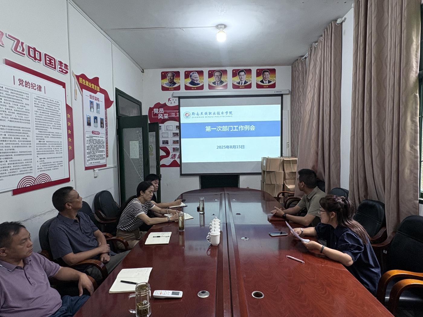 2025年8月15日招生就业处全体教职工在部门会议室召开本学期第一次工作例会。会议学习了习近平总书记近期重要讲话精神及中央、省州重要文件,同步对近期招生、就业重点工作进行安排。会议要求全体成员对标落实,强化纪律意识,深化作风建设,推动招生就业工作提质增效。