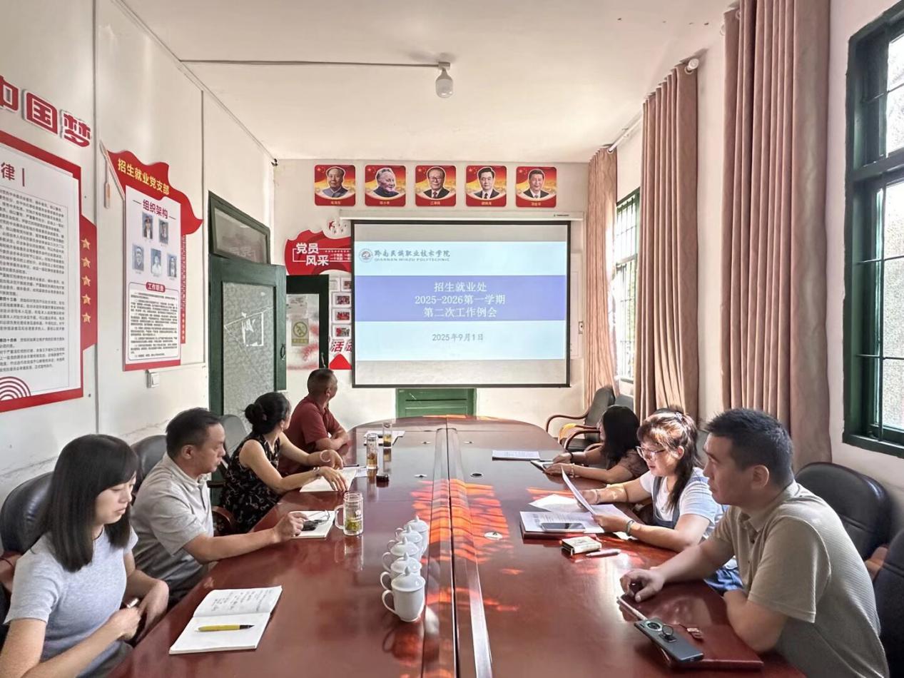 2025年9月1日招生就业处全体教职工在部门会议室召开本学期第二次工作例会。会议传达学习了习近平总书记近期作出的重要指示精神以及贵安新区高质量发展、全省半年经济工作及秋季学期开学部署会议精神,并对近期工作进行梳理和安排,确保各项工作有序推进。