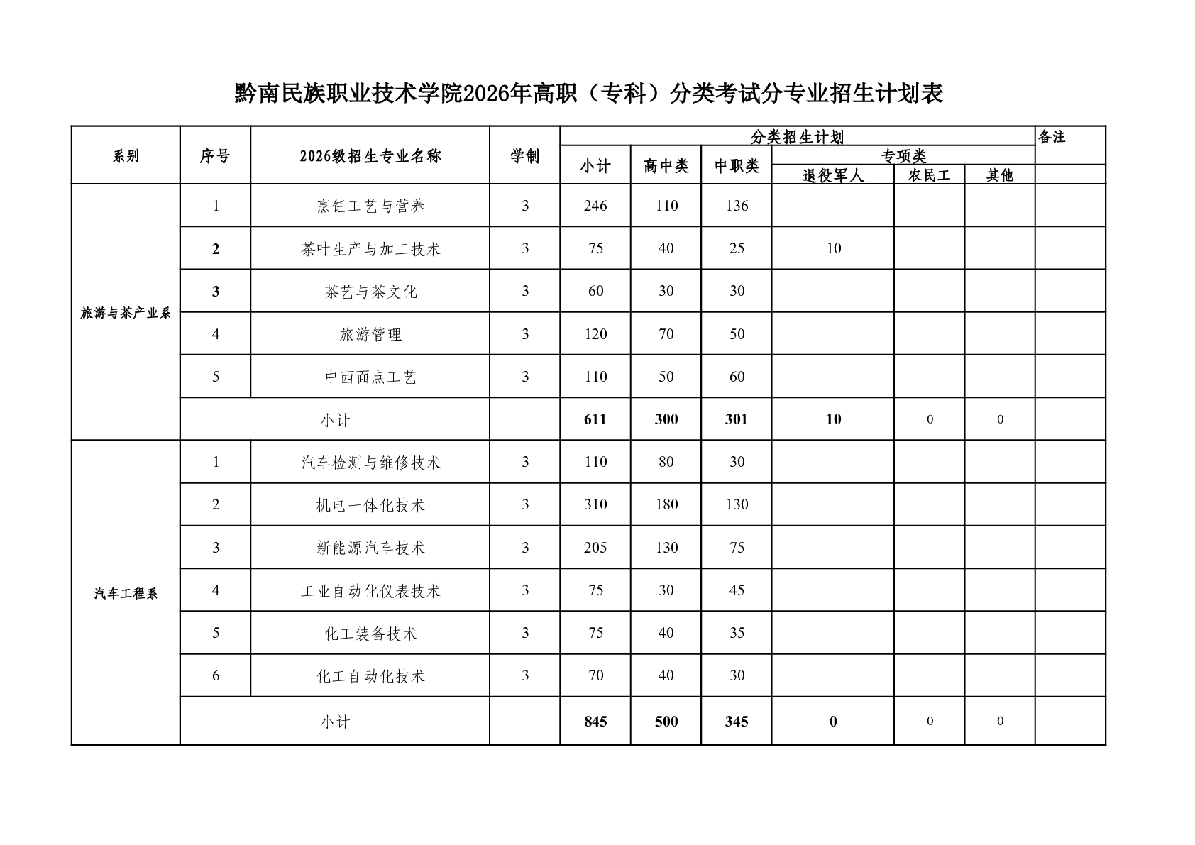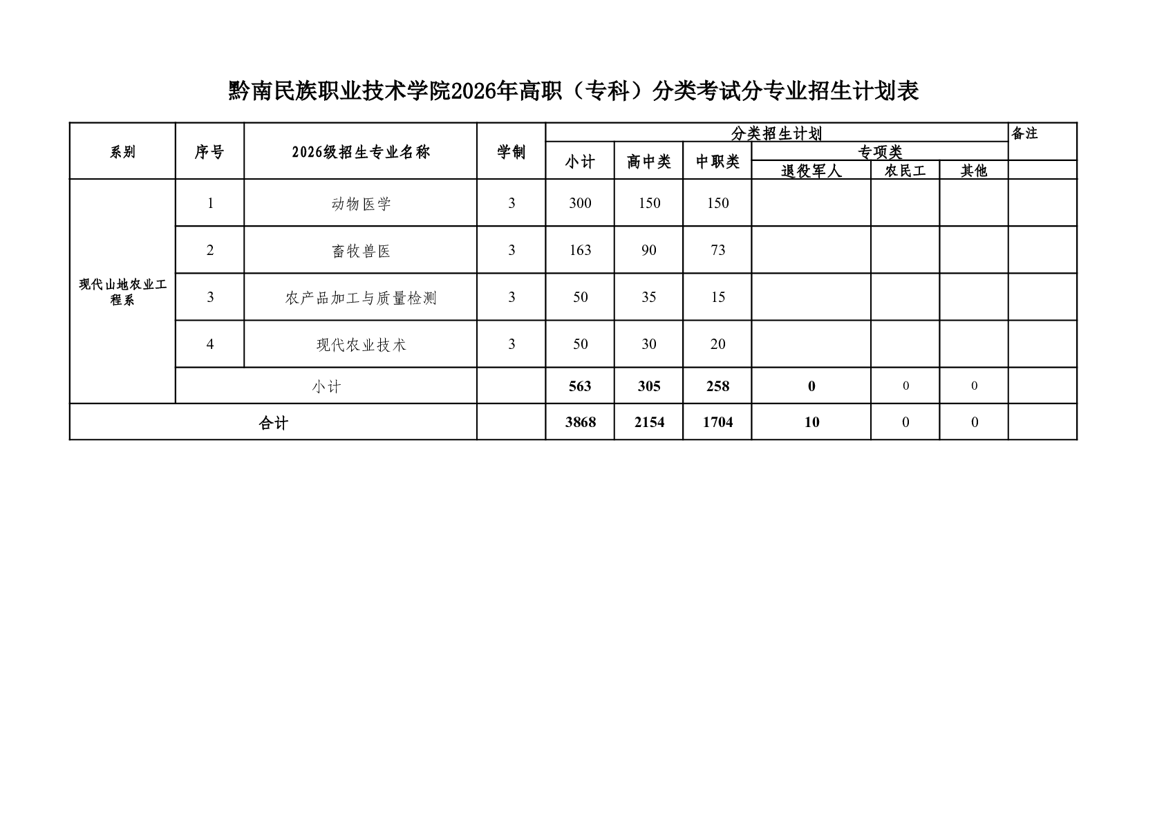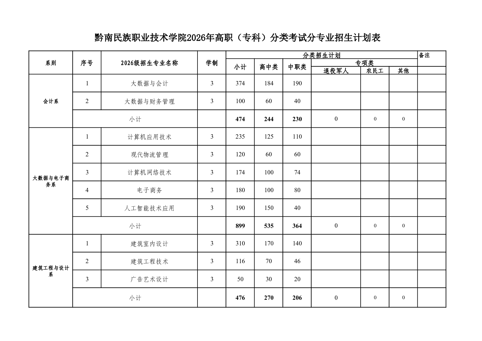 黔南民族职业技术学院2026年高职(专科)分类考试分专业招生计划表