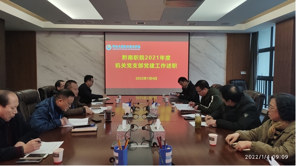 为深入学习习近平新时代中国特色社会主义思想,聚焦党史学习教育,推动全面从严治党向基层延伸, 1月4日上午,中共黔南职院机关总支委员会在知行楼六楼一会议室召开2021年度机关党支部党建述职评议会,五个在职党支部和三个离退休党支部支部书记、机关总支委员参加会议,大会由院机关总支书记史黔匀主持,学院党委副书记韦永革、党建办负责人姜克安同志到会进行指导。