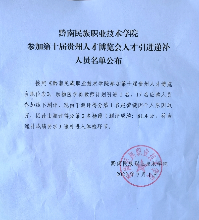 黔南民族职业技术学院参加第十届贵州人才博览会人才引进递补人员名单公布